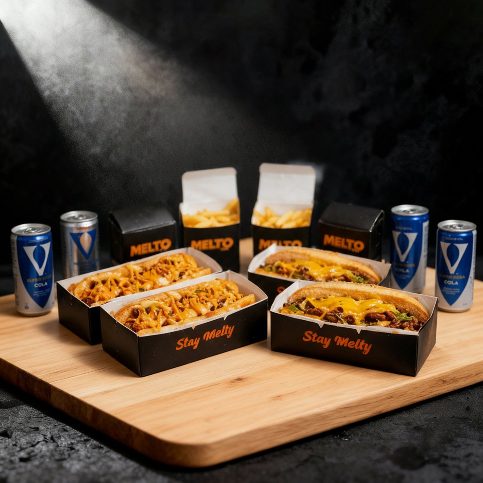 Four Melto Signature sandwiches, two large portions of fries, and four refreshing V Colas. The perfect family or friends feast, sharing Melto’s signature flavors in every bite.